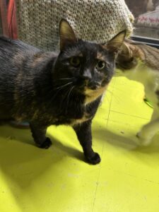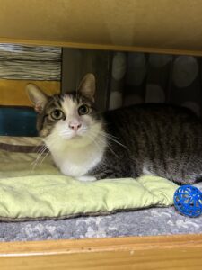 Christie’s personality truly shines during playtime! She’s full of energy and curiosity, always ready to chase after springs, foam balls, finger traps, or anything sprinkled with catnip! Christie thrives in the company of other cats, and will need a home with a feline friend to play and cuddle with. Though Christie hasn’t been tested with children or dogs, her social nature suggests she’d adjust well with a gentle introduction.