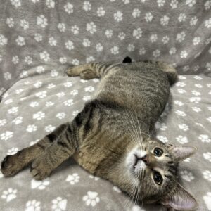 Meet Toffee, our beautiful tabby girl who’s ready to melt your heart! Found as a stray alongside her two brothers, this lovely lady has proven to be just as sweet as her name. Toffee adores attention and will happily soak up all the pets you can give! She’s especially fond of wet food, and can’t resist chasing after a wand teaser toy during playtime.